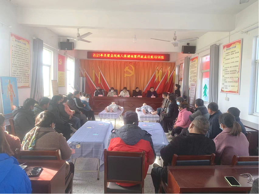 為積極推動(dòng)鄉(xiāng)村振興戰(zhàn)略,加快殘疾人的事業(yè)發(fā)展。在靈璧縣殘疾人聯(lián)合會(huì)領(lǐng)導(dǎo)的帶領(lǐng)下,我校于2021年11月23日在黃灣鎮(zhèn)單營(yíng)村組織開(kāi)辦殘疾人保健按摩培訓(xùn)。