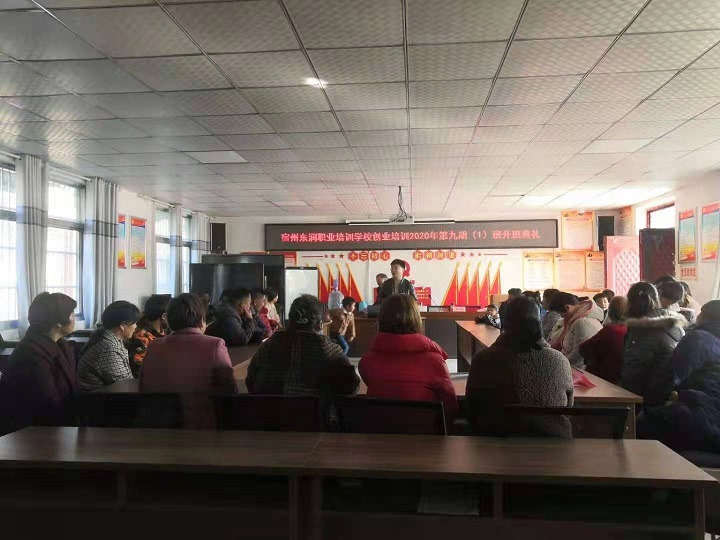 2020年11月20日上午8:30,宿州市東潤職業(yè)培訓學校2020年“SYB創(chuàng)業(yè)培訓班第九期”開班典禮在解集鄉(xiāng)龍山村黨群服務中心隆重舉行。上午8:00,學員們陸續(xù)到場,簽到、領書、領水杯,秩序井然,學員熱情高漲。